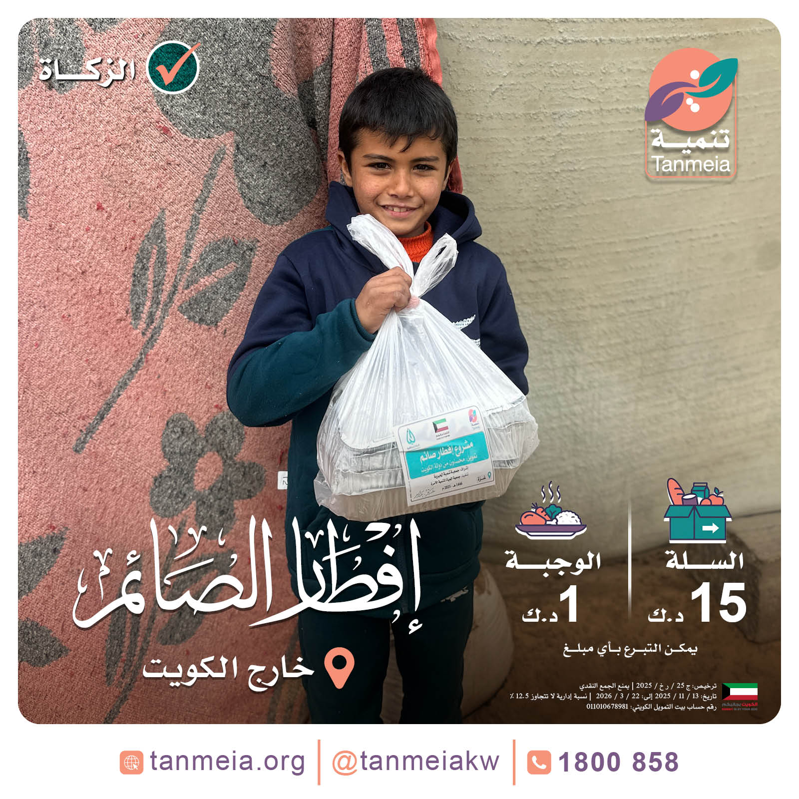 في بقاعٍ عديدة خارج الكويت، يحلّ وقت الإفطار على أسرٍ فقيرة، ولاجئين، ونازحين، أنهكهم الفقر والنزوح وغلاء المعيشة، فينتظرون لقمةً تسد الجوع وتعينهم على إتمام صيامهم.