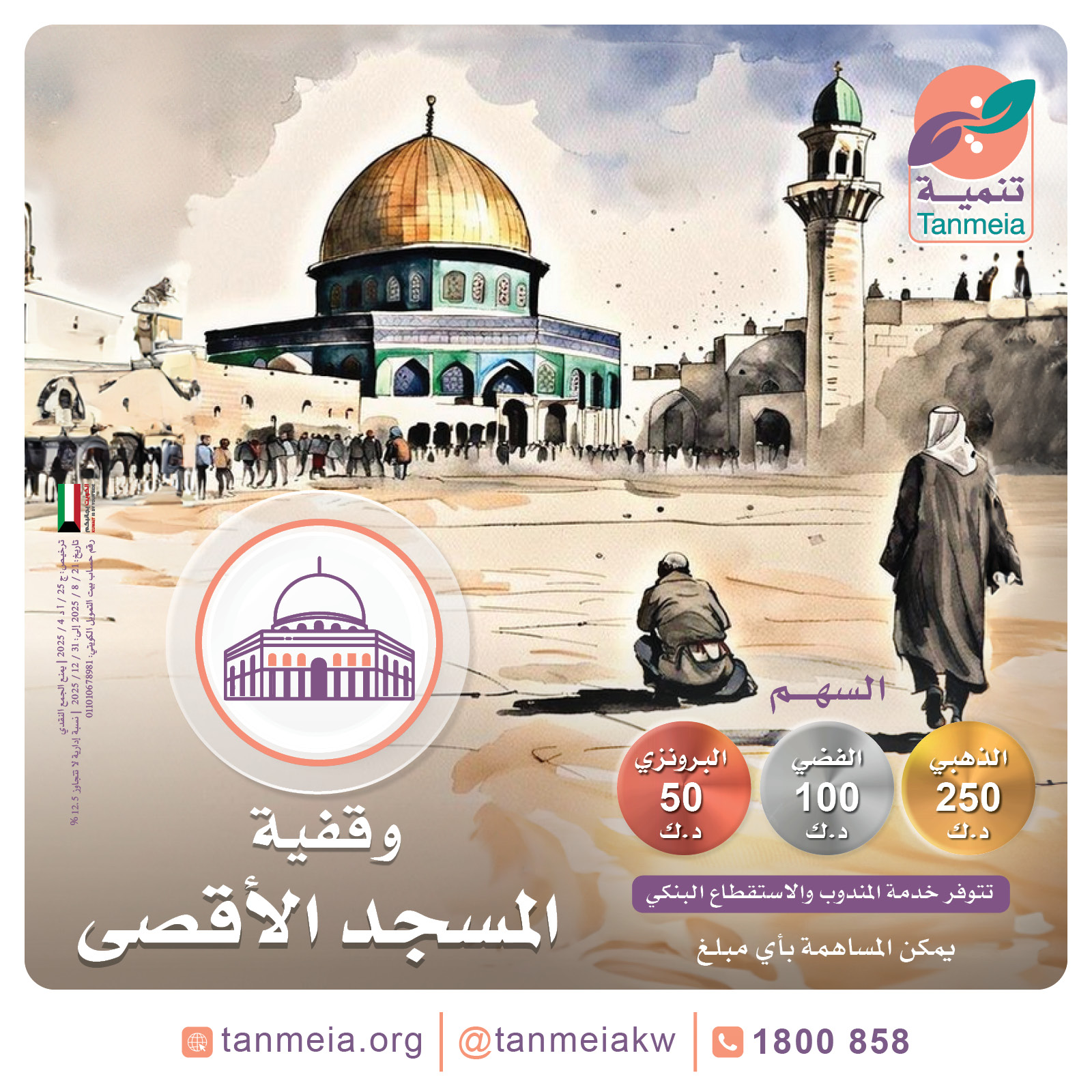 فلسطين جرح الأمة وقضيتها المركزية، والمسجد الأقصى أولى القبلتين وثالث الحرمين الشريفين. ومن منطلق المسؤولية الدينية والإنسانية، أطلقت جمعية تنمية الخيرية وقفية فلسطين، لتكون وقفية شاملة لدعم مشروعات المسجد الأقصى والقدس وغزة وعموم فلسطين، تعزيزًا للصمود وحفاظًا على المقدسات في أرض الإسراء.